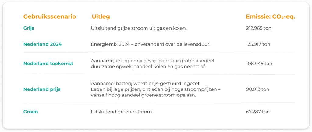 Cruciaal voor iedere berekening is de vraag: wat voor stroom slaat de batterij op? Is dat uitsluitend grijs (opgewekt met gas en kolen) of volledig groen (uit hernieuwbare bron)? Afhankelijk van het scenario dat je daarin kiest, pakken de impact-cijfers wezenlijk anders uit. Hieronder kort op een rij de mogelijke scenario’s en de mogelijke impact. Omdat Antares prijs-gestuurd in wordt gezet, wordt in het onderzoek gerekend met het scenario “Nederland prijs”.