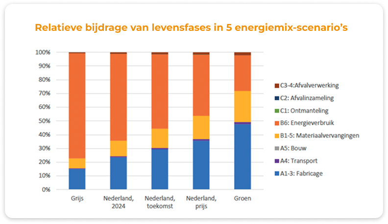 Afhankelijk van het scenario, zijn verschillende levensfases impactvoller dan anderen. Zo is in het grijze scenario het daadwerkelijke energieverbruik van de batterij meest bepalend, in het groene scenario juist de fabricage: