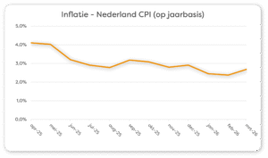 De inflatie in Nederland stabiliseerde in het eerste kwartaal van 2026, in lijn met de verwachting die aan het eind van 2025 al werd afgegeven. De CPI-inflatie bewoog rond de 2,5 tot 3,0 procent op jaarbasis. Hogere gasprijzen als gevolg van de situatie in het Midden-Oosten zorgden voor een tijdelijke opwaartse druk, deels gecompenseerd door de afvlakkende loonstijgingen en een sterkere euro. De stijging van de inflatie in maart schreef het CBS vooral toe aan hogere energie- en motorbrandstoffenprijzen