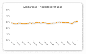 De marktrente (rente op Nederlandse staatsleningen met een looptijd van tien jaar) bleef in het eerste kwartaal van 2026 bewegen rond niveaus die we ook eind 2025 zagen. De Europese Centrale Bank (ECB) liet de depositorente in dit kwartaal ongewijzigd op 2,0%, na de reeks verlagingen in 2025. De toegenomen onzekerheid door geopolitieke spanningen, de dreigende energiecrisis en de wisselende inflatieverwachtingen maakten verdere verlagingen vooralsnog minder voor de hand liggend.