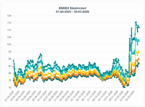 De elektriciteitsprijzen op de termijnmarkt (Endex) lieten in het eerste kwartaal van 2026 een beweeglijk beeld zien. Na een relatief rustige start in januari – met lagere prijsverwachtingen voor de middellange termijn mede door de verwachte groei van duurzame capaciteit – nam de volatiliteit toe naarmate het kwartaal vorderde. De geopolitieke spanningen in het Midden-Oosten drukten een stempel op de markt: hogere gasprijzen vertaalden zich in een opwaartse druk op de termijnprijzen voor elektriciteit.
