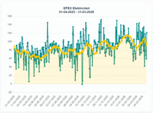 De spotmarkt (EPEX) liet in januari en februari een rustiger beeld zien dan in de tweede helft van 2025. Het aantal uren met negatieve stroomprijzen was in de eerste twee maanden van het jaar laag – een gevolg van beperkte zonne-energie in de wintermaanden en relatief goede windproductie die beter aansloot op de vraag. In maart nam het aanbod van hernieuwbare energie weer toe, met meer prijsvolatiliteit als gevolg.