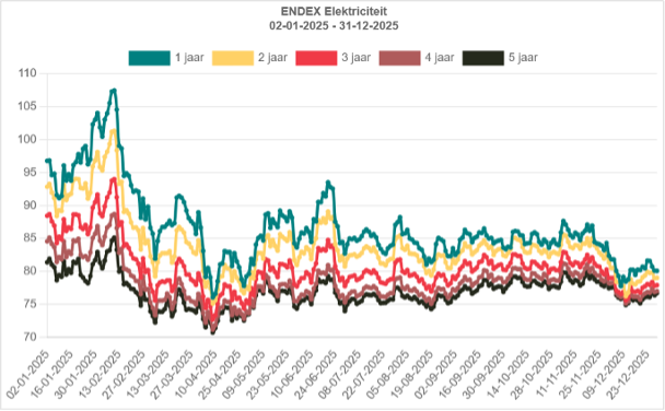 In het vierde kwartaal van 2025 bleven de ENDEX-termijnprijzen voor elektriciteit relatief stabiel tot licht dalend. Dit weerspiegelde lagere verwachtingen voor gas- en CO₂-prijzen en meer vertrouwen in de beschikbaarheid van hernieuwbare productie. De markt rekent op een beter gebalanceerd energiesysteem op middellange termijn. De naar elkaar toe bewegende termijncurves (de gekleurde lijnen) wijzen op afnemende onzekerheid en een meer gelijkmatig prijsbeeld voor de komende jaren.