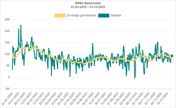 In het vierde kwartaal van 2025 lieten de spotprijzen op de EPEX-markt een wisselend beeld zien. Windrijke perioden zorgden regelmatig voor lage prijzen, terwijl koudere dagen met minder wind tot tijdelijke pieken leidden. Over het geheel genomen bleef de markt volatiel, maar binnen een beheersbaar en voorspelbaar bandbreedte.