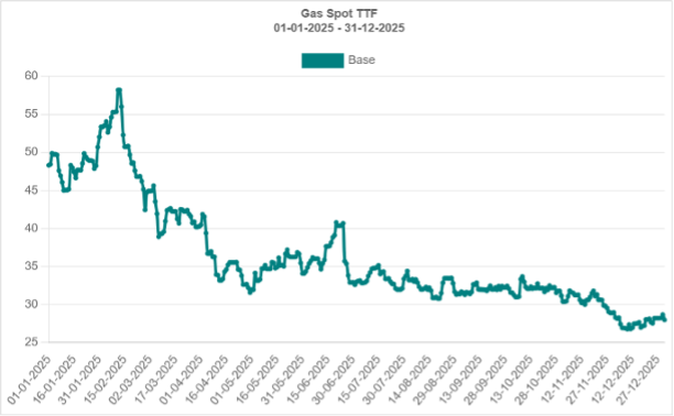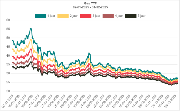 In het vierde kwartaal van 2025 bewogen de TTF-gasprijzen binnen een relatief gematigde bandbreedte. Na eerdere jaren van hoge volatiliteit bleef de markt rustiger, mede door goed gevulde Europese gasopslagen en een evenwichtige aanvoer. Koudere weersperioden zorgden tijdelijk voor opwaartse druk, maar deze pieken waren beperkt van duur. Ook geopolitieke ontwikkelingen leidden niet tot grote verstoringen.