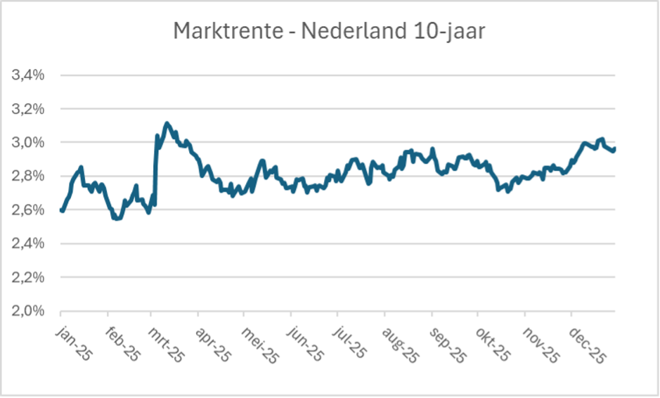 In het vierde kwartaal van 2025 liep de 10-jaars Nederlandse marktrente licht op, met 8 basispunten van 2,89% naar 2,97%. Na de sterke renteverhogingen en volatiliteit in de voorgaande jaren werd in deze periode steeds duidelijker dat de inflatie verder afkoelde en dat de economie zich geleidelijk aanpaste aan het hogere renteniveau. Beleggers hielden rekening met een gematigder inflatiepad en een voorspelbaarder monetair beleid, wat resulteerde in beperkte schommelingen van de lange rente.