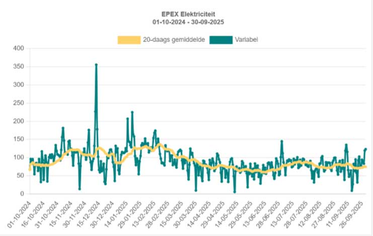 Tegelijkertijd namen de fluctuaties van spotprijzen op de EPEX SPOT-markt toe (grafiek hieronder): op zonnige en windrijke momenten sloten ze zelfs rond of onder de € 60/MWh – mede door overvloedige productie – terwijl in uren met weinig hernieuwbaar aanbod en hogere vraag de prijs weer hoger opliep.