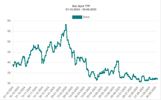 In het derde kwartaal van 2025 daalden de termijnprijzen voor het Dutch TTF natural gas-contract geleidelijk naar ongeveer € 30–33 per MWh (≈ € 8–9 per GJ) in Nederland, mede door milde vraag in de zomer en de verwachting dat voldoende opslag opgebouwd werd.