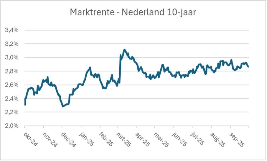 In het derde kwartaal van 2025 is de marktrente (rente op Nederlandse staatsleningen met een looptijd van tien jaar) licht gestegen, van ongeveer 2,76% naar 2,9%. Dat kwam vooral doordat beleggers verwachten dat de inflatie iets hoger blijft en dat centrale banken hun rente voorlopig niet verder verlagen.