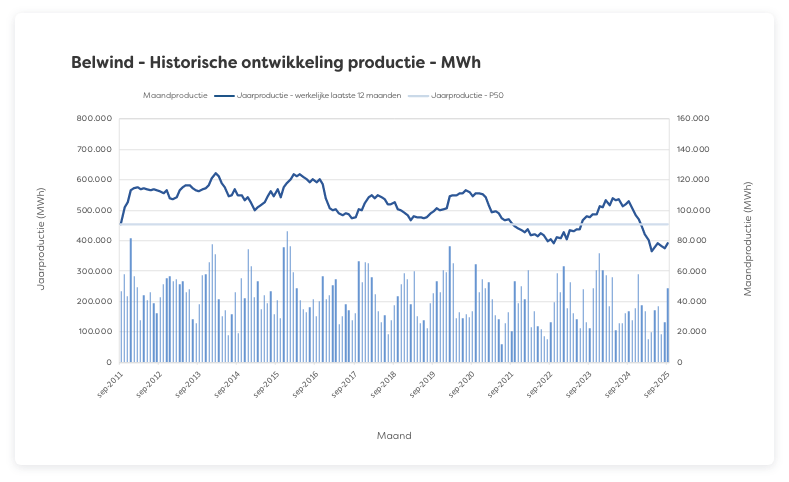 Na een teleurstellend eerste halfjaar, is het derde kwartaal van 2025 ietsje beter geweest voor onze windparken. Toch kunnen we niet spreken van een goed kwartaal: de opbrengsten waren laag. Dit is logisch te verklaren door de weinige wind, waarbij we ook zien dat vergelijkbare parken met lage productiecijfers kampen. Hoewel onder verwachting, is het positief dat in augustus de windproductie al weer significant hoger was dan in juli.