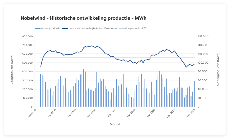 De technische beschikbaarheid van beide projecten is goed én stabiel. Die lag voor Belwind de eerste 6 maanden en voor Nobelwind zelfs de eerste 8 maanden van 2025 ruim boven de gegarandeerde beschikbaarheid van 95%. Het is nu enkel wachten op meer wind!